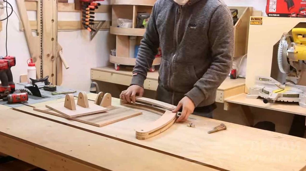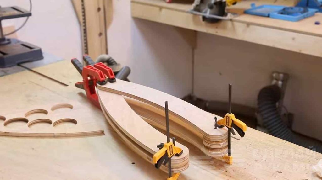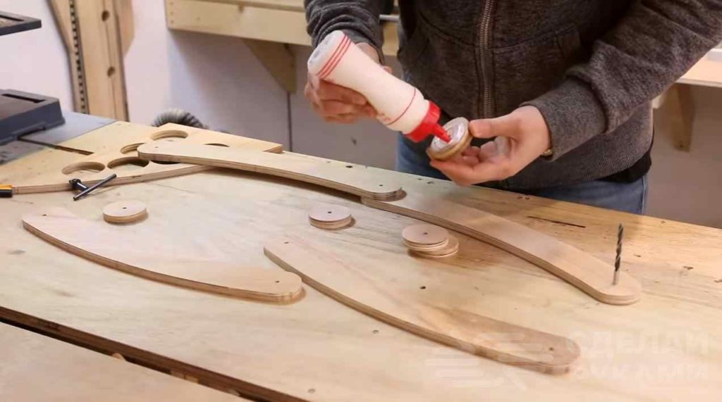 На следующем этапе вырезаем из фанеры круглые заготовки подходящего диаметра. Сверлим отверстия в кружках и ламелях, после чего склеиваем их и зажимаем струбцинами.