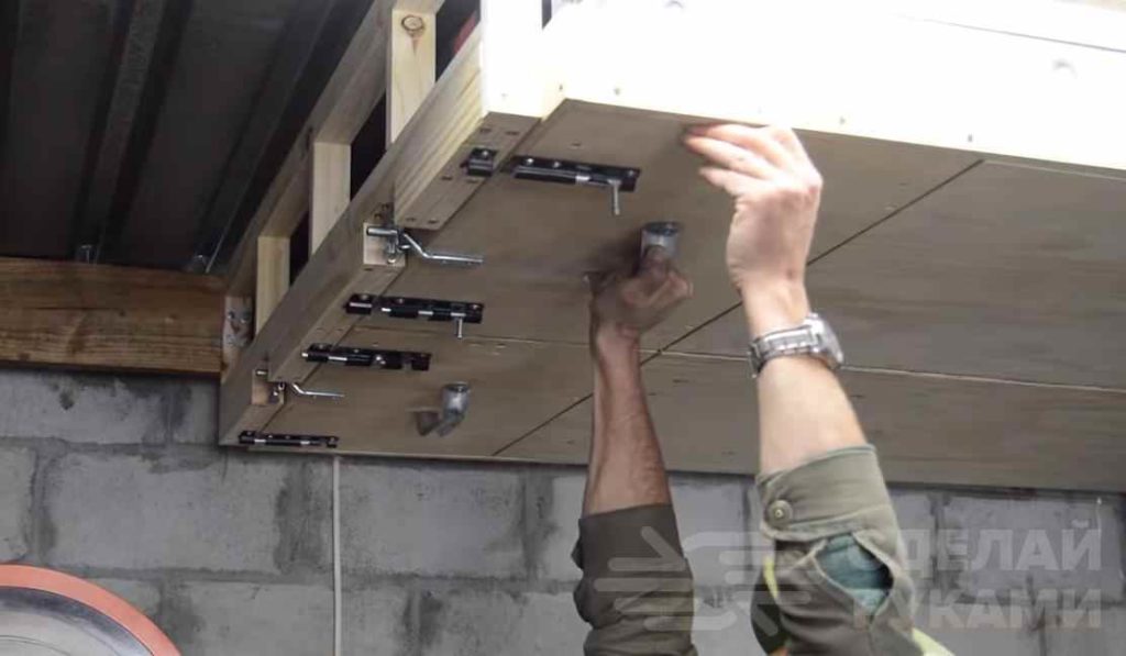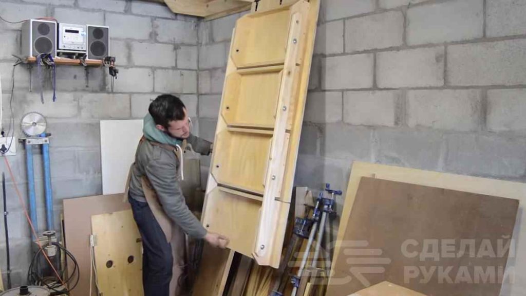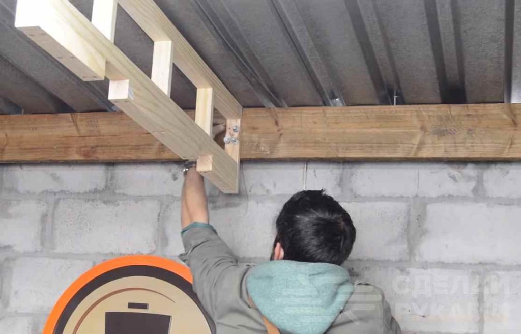 После этого из деревянных брусков автор изготавливает рамку, которая также крепится под потолком, и служит для фиксации полок в сложенном состоянии. Устанавливаем необходимую фурнитуру.