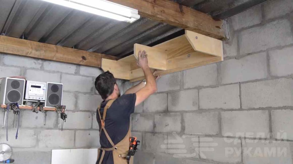 На следующем этапе из напиленных заготовок мастер собирает короб, к которому будут крепиться полки. Он устанавливается под потолком впритык к стене.