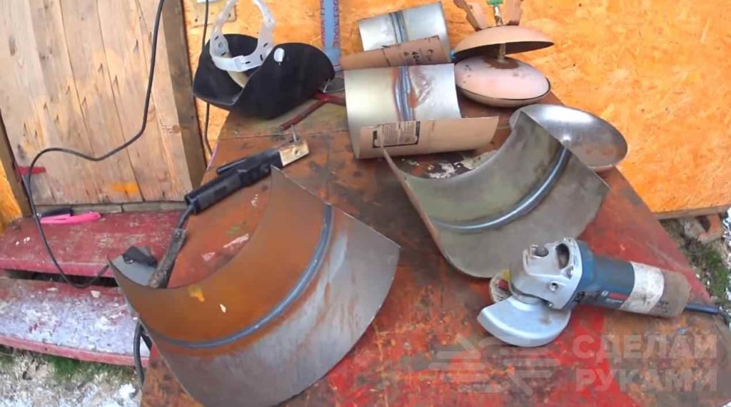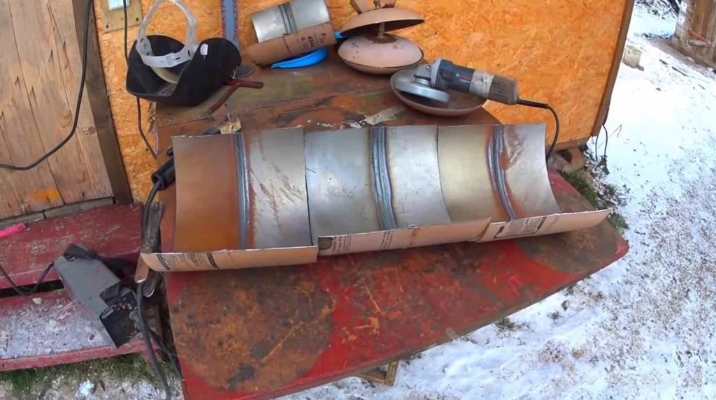 Берем три таких половинки и свариваем их вместе. Это и будет отвал. С наружной стороны привариваем ребра жесткости из круглого прутка.