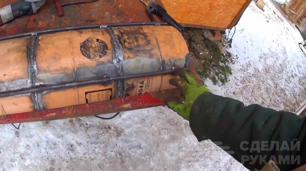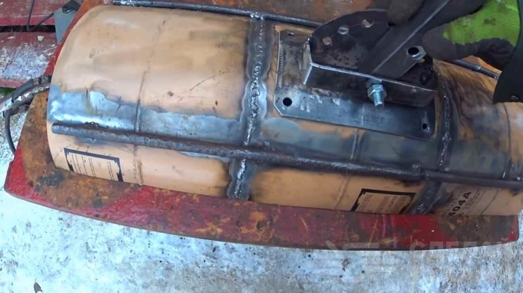 В отвале сверлим 4 крепежных отверстия, чтобы закрепить площадку. Дополнительно мастер приваривает усиления из кусков металла.