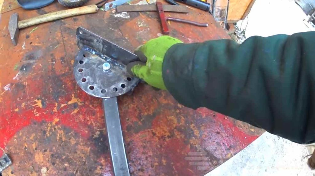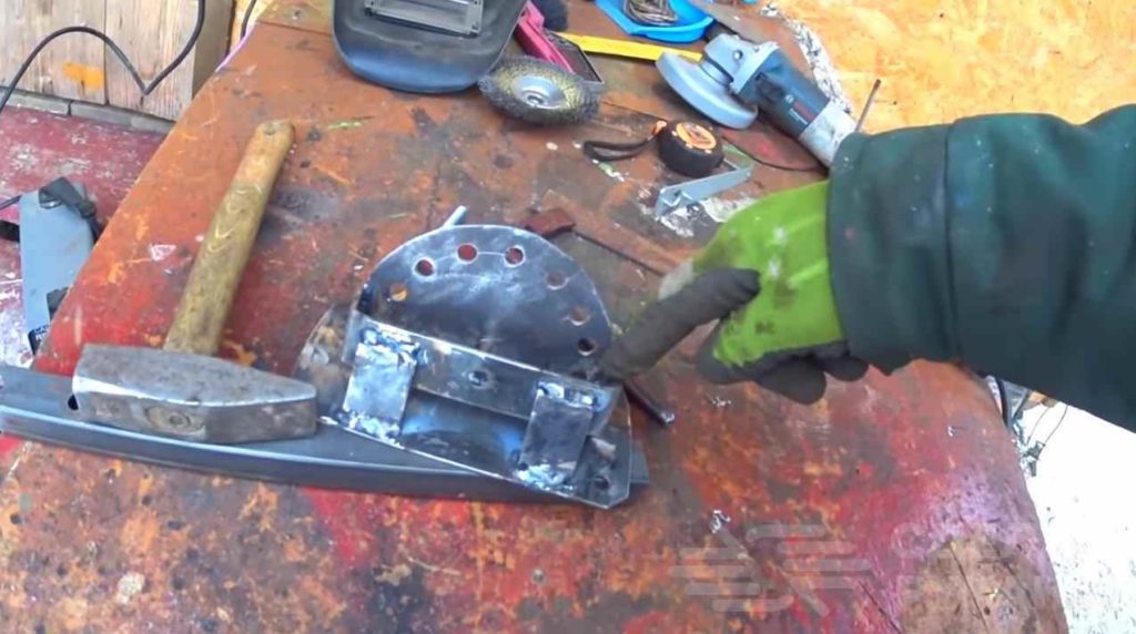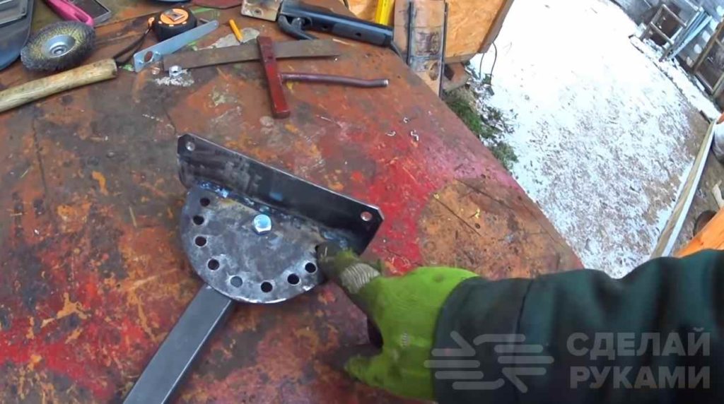 На следующем этапе из кусков листового металла необходимо будет изготовить поворотную крепежную площадку с отверстиями для регулировки угла отвала.