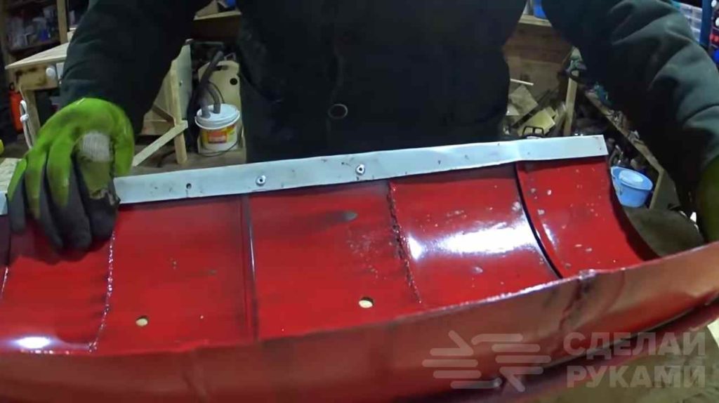На нижнюю часть отвала надеваем «насадку» из листового металла (усиление) и крепим заклепками.