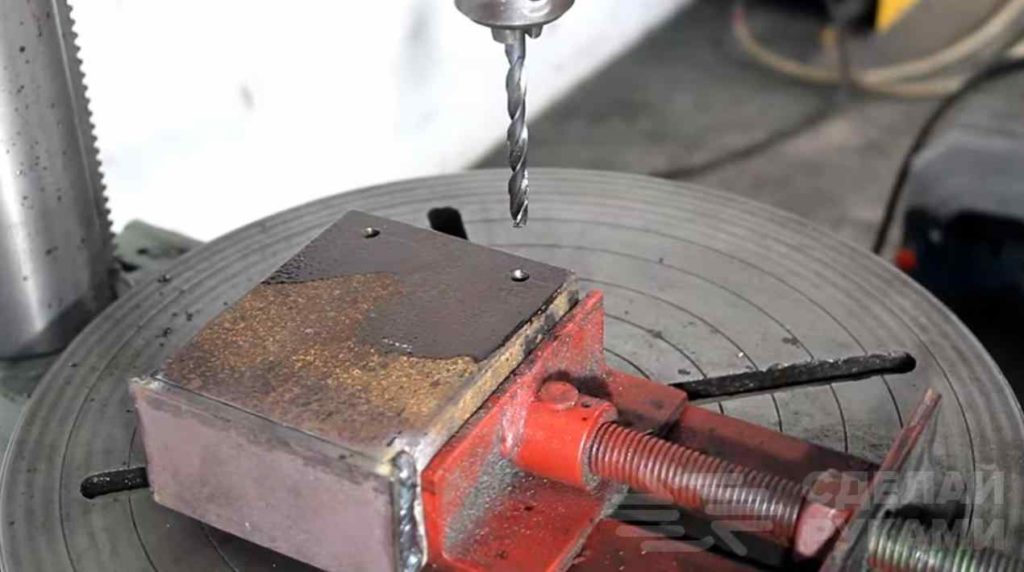 На следующем этапе отрезаем еще один кусок швеллера, и привариваем к торцу металлическую пластину. Затем сверлим два отверстия. Как вы уже догадались — это будет подвижная губка.