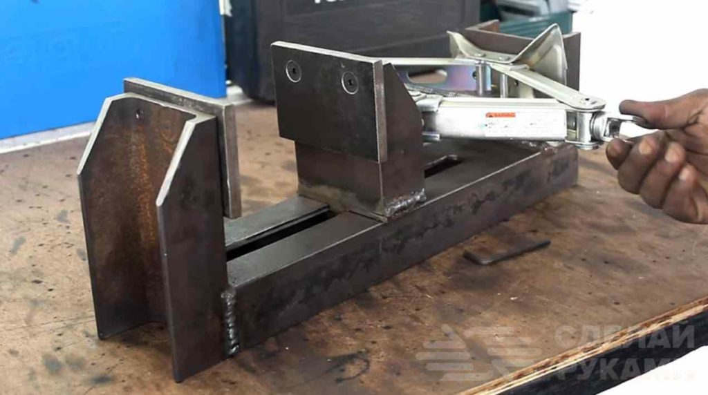 Далее между полками швеллера привариваем еще одну пластину из металла, и крепим к подвижной губке механический домкрат.