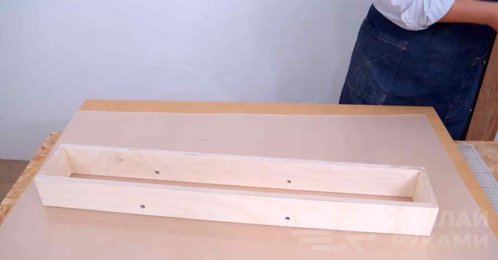 Накрываем сверху и снизу двумя крышками из того же листа фанеры, оставив вылет на толщину присоединяемой части подвижного механизма.