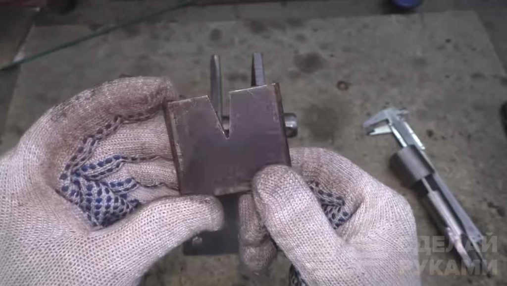 Далее из двух пластин толщиной 10 мм автор вырезает заготовки Г-образной формы. Их надо будет приварить потом к основанию.