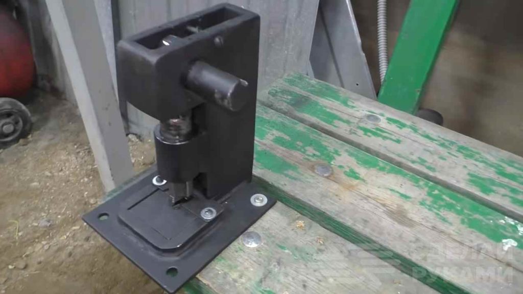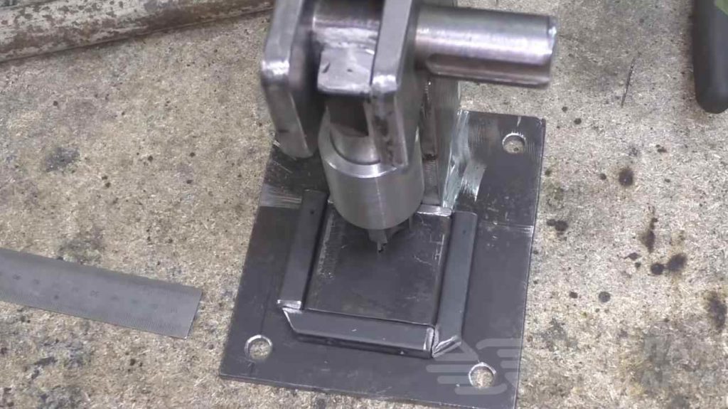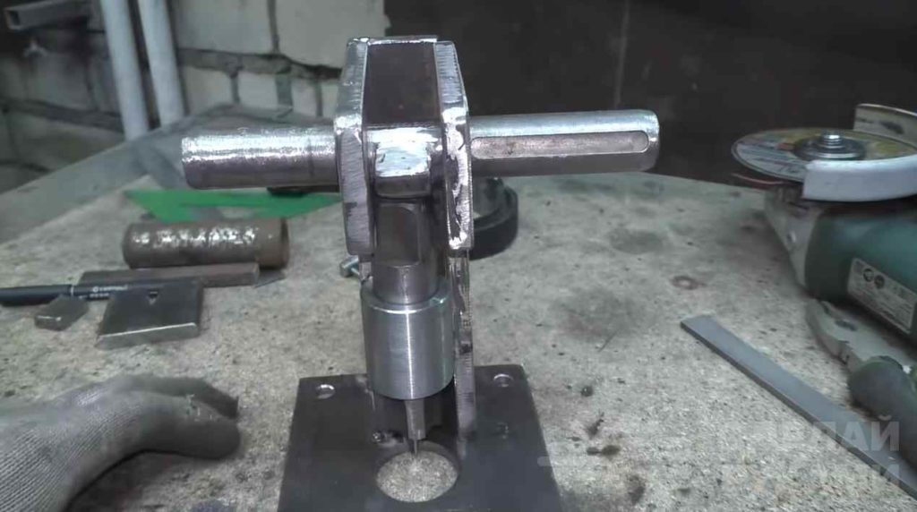 В основании сверлим отверстие. По центру вала автор вытачивает небольшой выступ прямоугольной формы, который будет давить на метчик, установленный между боковыми стенками.