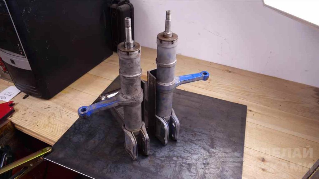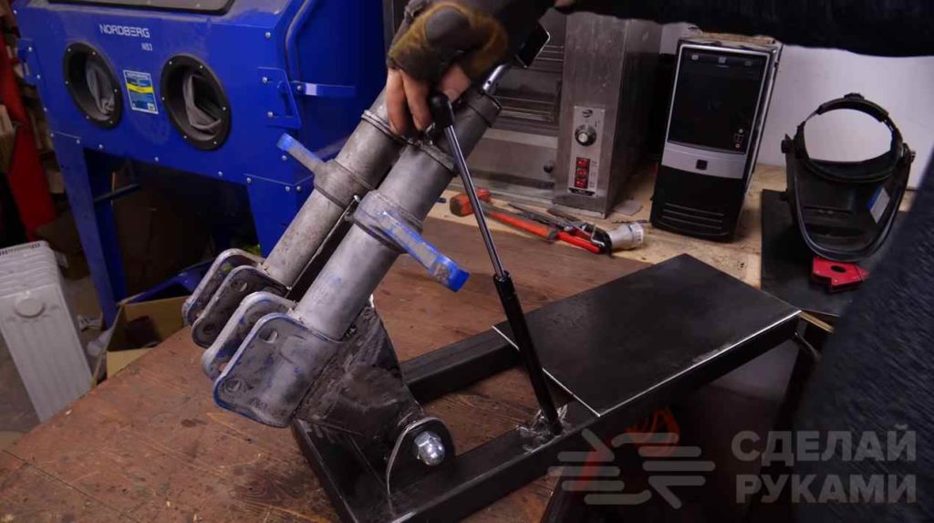 Далее крепим узел с автомобильными стойками, и дополнительно нужно установить газлифт, который в данном случае будет играть роль возвратной пружины.