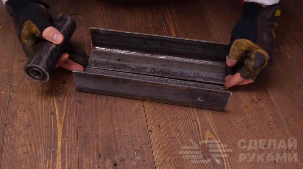 На следующем этапе автор отрезаем два уголка и сваривает их вместе (можно также использовать подходящий по размеру кусок швеллера). Привариваем кусок круглой трубы с подшипниками.