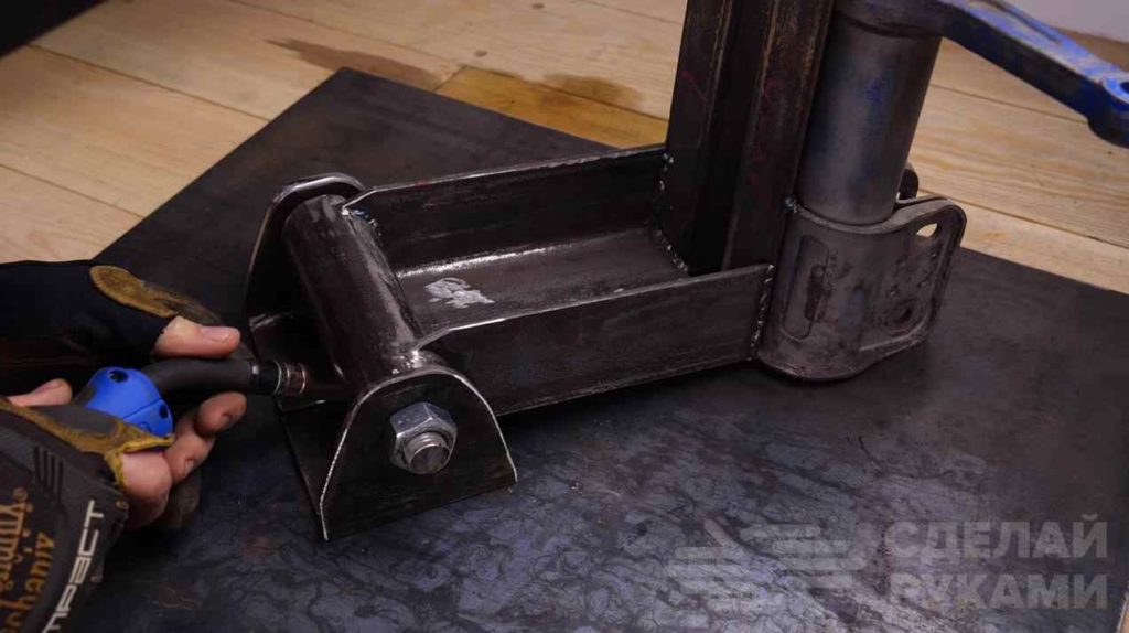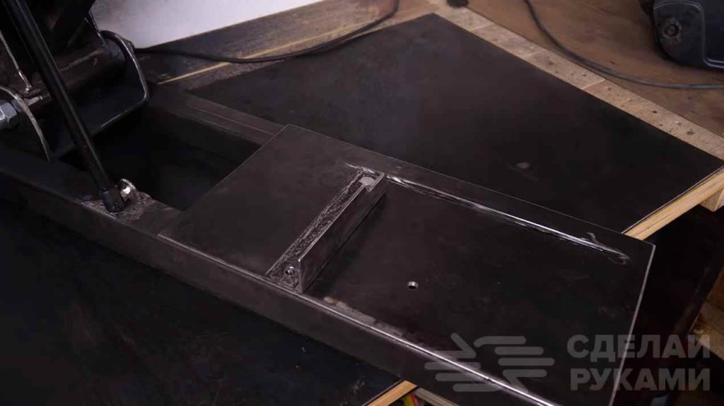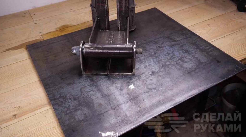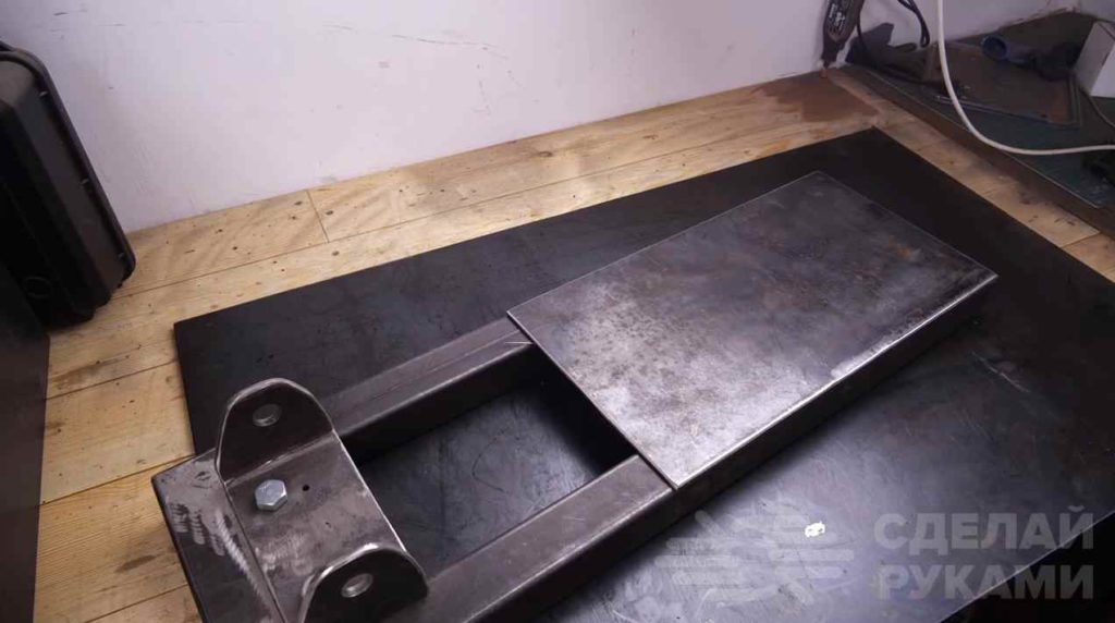 Из профильной трубы свариваем станину, а к ней нужно будет прикрутить на болты крепление из уголков. Затем к станине привариваем лист металла.