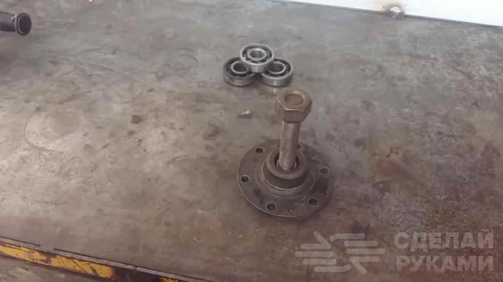 Для изготовления самодельной стойки потребуются различные куски металла, фланец, резьбовая шпилька и подшипники. Все эти комплектующие без проблем можно найти в гараже.