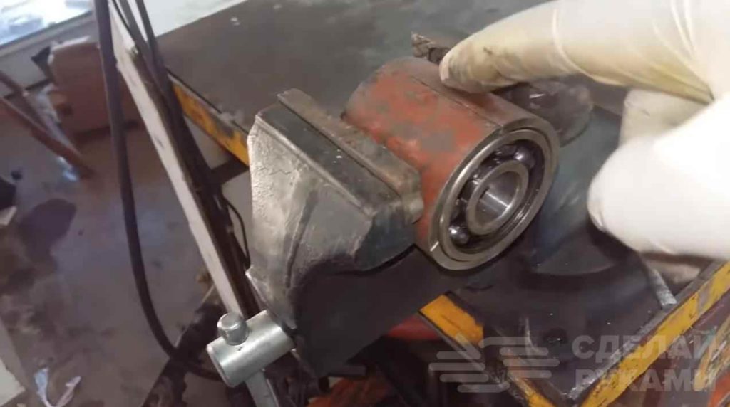 На следующем этапе отрезаем кусок толстостенной трубы и разрезаем его вдоль. Внутрь вставляем вплотную друг к другу подшипники, после чего место пропила завариваем.