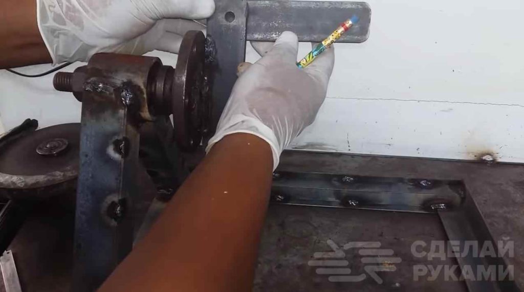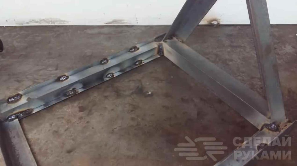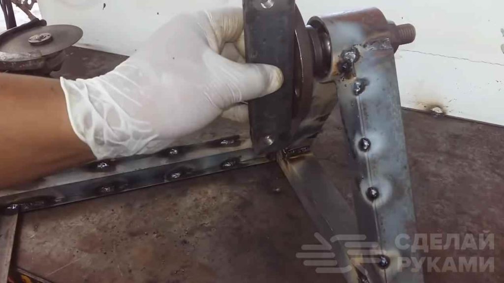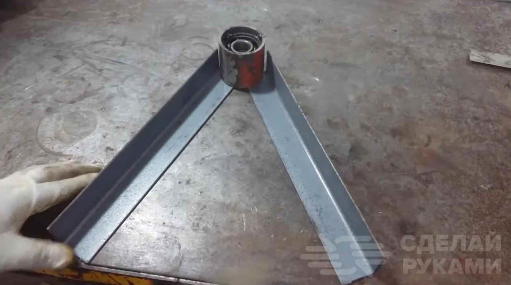 Потом из отрезков уголка свариваем основание. Привариваем к нему стойку с втулкой. Устанавливаем обратно шпильку с фланцем, затягиваем гайкой.