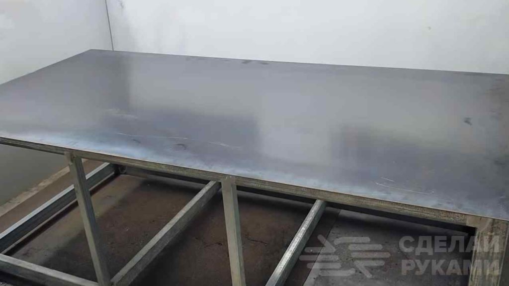 После этого приступаем к изготовлению каркаса стола, согласно чертежу. Отрезаем от листового металла кусок подходящего размера, укладываем сверху каркаса. Это будет столешница верстака. Но приваривать ее пока не нужно.