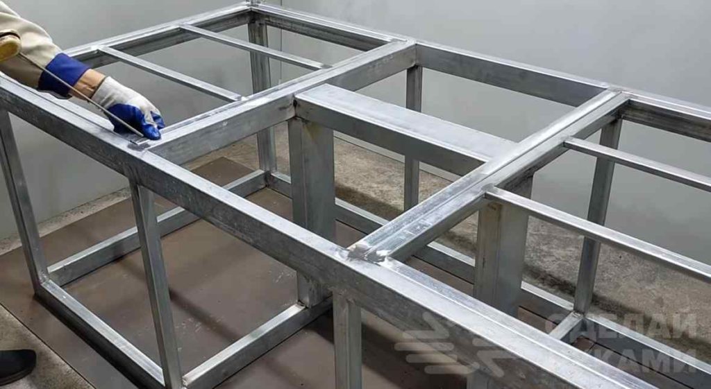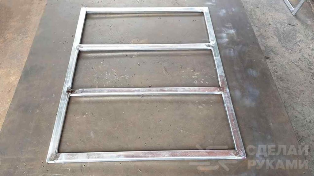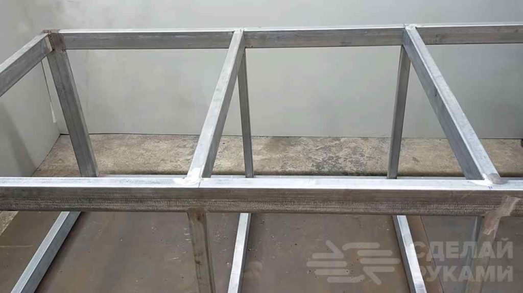 На следующем этапе свариваем рамки из профильной трубы. Устанавливаем рамки в нижней части каркаса и затем обвариваем.