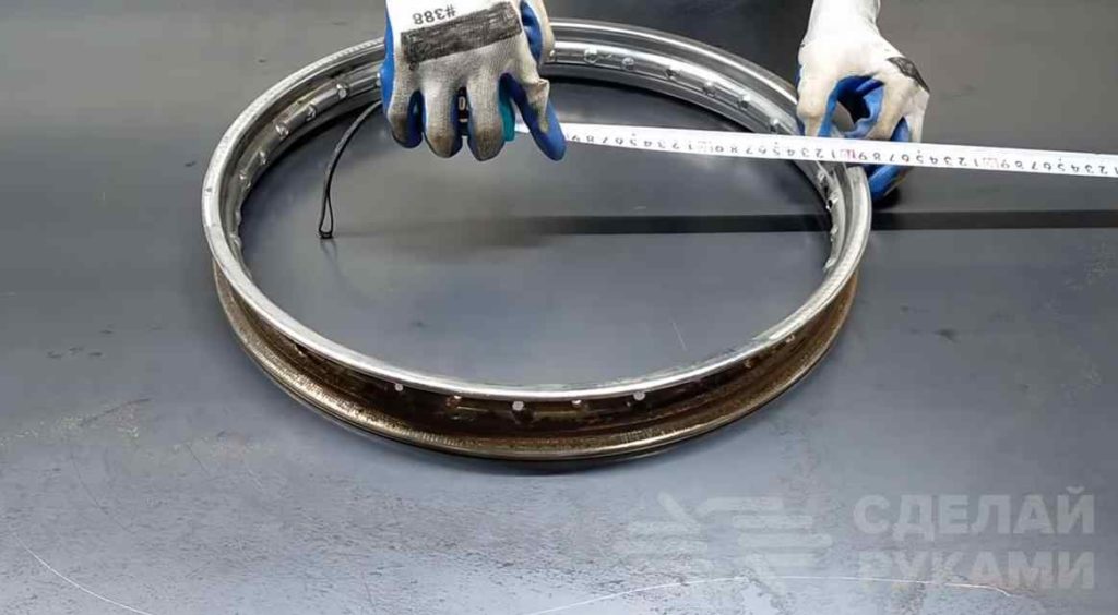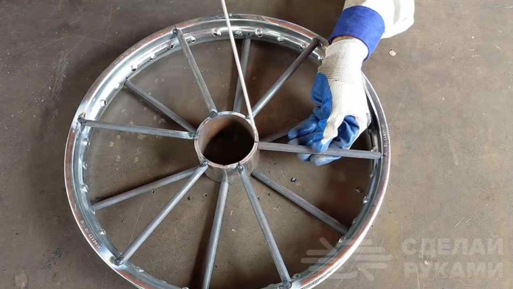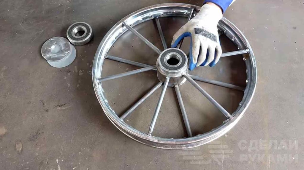 Отрезаем кусок круглой трубы и отрезки круглого прутка. Привариваем прутки внутри колесного обода, а к ним — кусок круглой трубы. В трубу устанавливаем подшипники. Торцы завариваем шайбами.