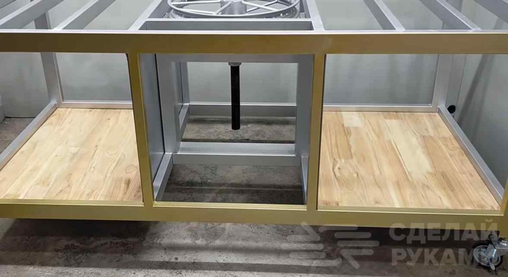Усиливаем верхнюю часть каркаса отрезками профильной трубы. К нижней части крепим колесики. Зачищаем металл, грунтуем и красим. Нижние полки стола можно сделать из фанеры или дерева.