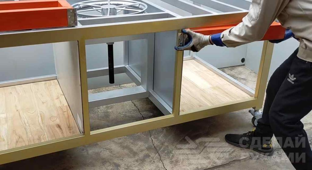 На последнем этапе останется только изготовить и установить ящики, а также закрепить с помощью заклепок столешницу.