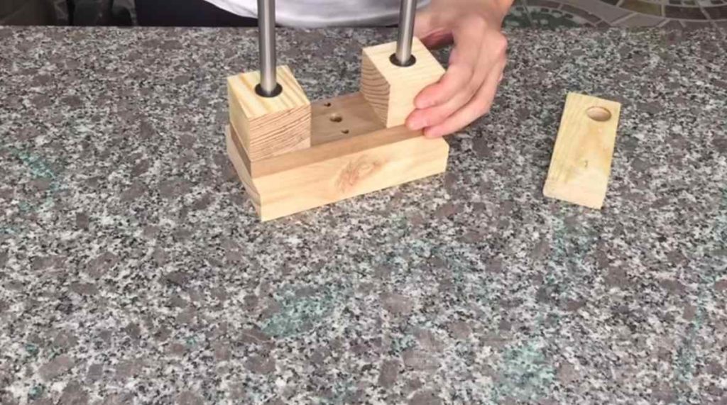 Первым делом необходимо отпилить подходящий по размеру кусок доски и два кубика от деревянного бруска. Крепим их по краям планки. После этого в кубиках нужно просверлить отверстия под направляющие.