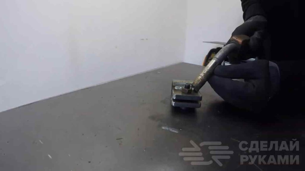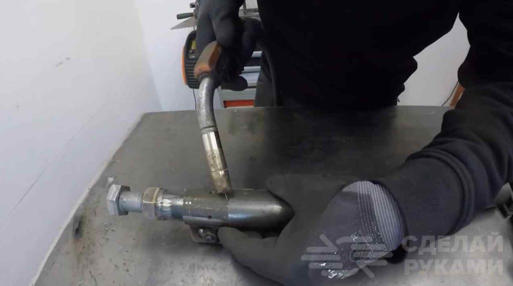 Просверливаем два отверстия и фиксируем всё на болтовое соединение. Надеваем на трубу с поворотным механизмом нашу заготовку и привариваем к её краю трубу подходящего диаметра.