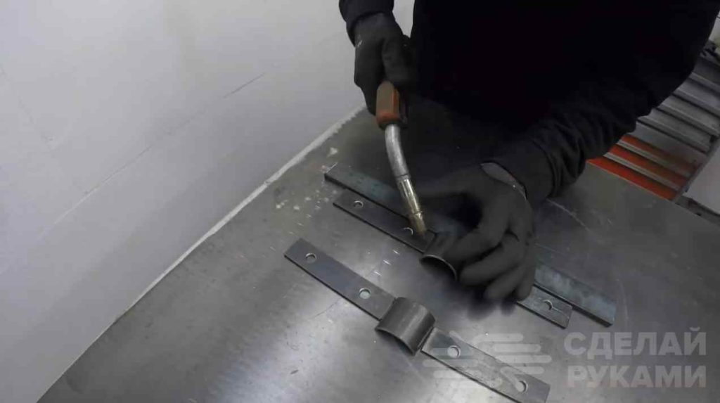 Механизм фиксирования будем изготавливать из отрезка трубы, прорезанного с одной стороны, и двух пластин листового металла.