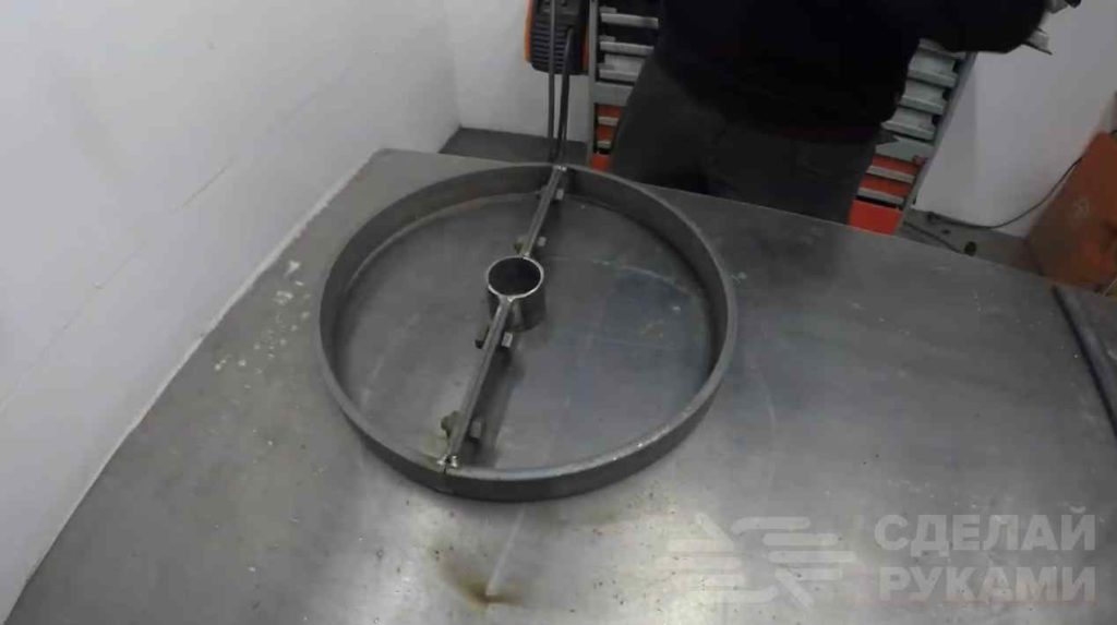 Для изготовления подставки для ног согнём пластинку листовой стали по кругу и разрежем её ровно посередине. По центру располагаем отрезок трубы, распиленный пополам.
