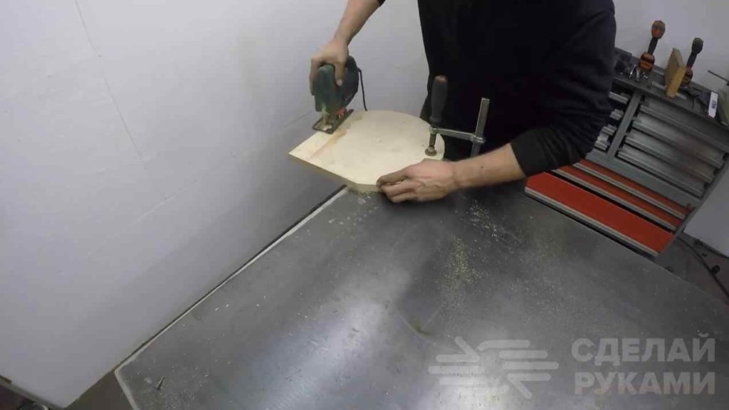 Сиденье будем изготавливать из листа фанеры. Вырезаем необходимой формы сиденье. Зачищаем все края, по мере надобности обтягиваем мягкой обивкой. Для крепления к стулу, вырежем круглую заготовку из листовой стали и приварим её к вращающемуся механизму (шляпке болта).