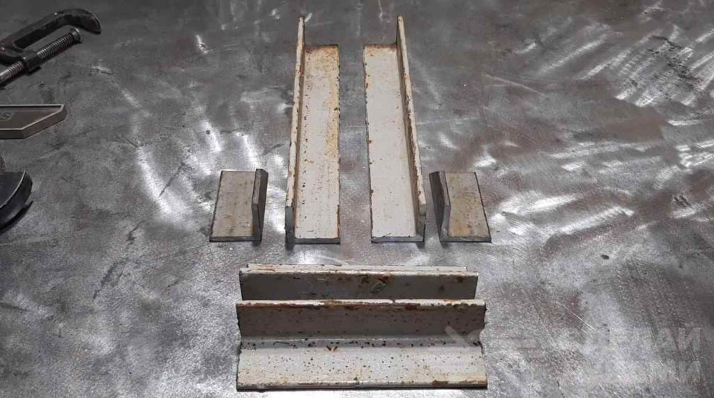 Для начала определимся с длиной движущейся части тисов. Для этого отрезаем уголки необходимой длины и свариваем их торцами полок (для облегчения можно использовать швеллер).