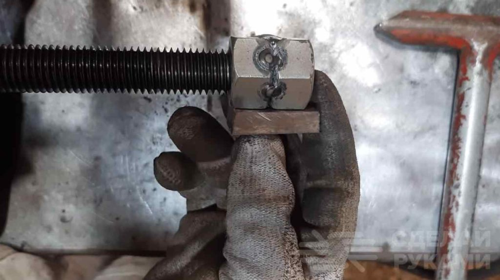 Вынимаем движущуюся часть и можно работать с ней. В торце привариваем пластину металла и проделываем отверстия. Продеваем шпильку и привариваем к её краю гайку.