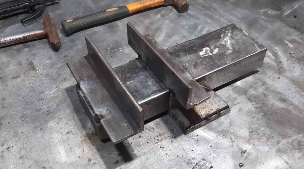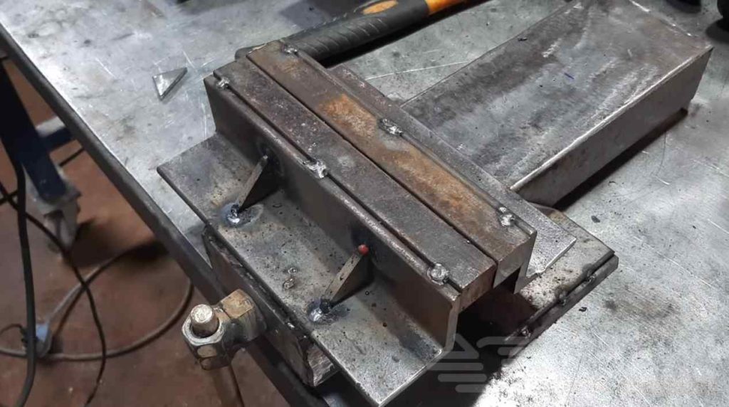 Привариваем их друг напротив друга к уголкам. Для лучшего сцепления можно нанести насечки. Корпус тисов будем делать из листовой стали, сваренной под необходимыми углами.