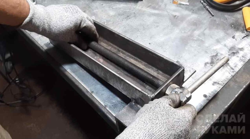 На следующем этапе можно изготовить губки для тисов. Автор делает их из двух уголков, приваренных к станине и движущейся части, а сами губки изготовим из квадратной арматуры.