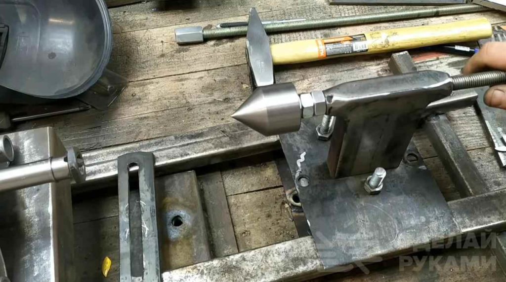 На следующем этапе к одной из подвижных площадок надо будет приварить заднюю бабку с конусным центром, который надевается на шпильку с подшипниками.