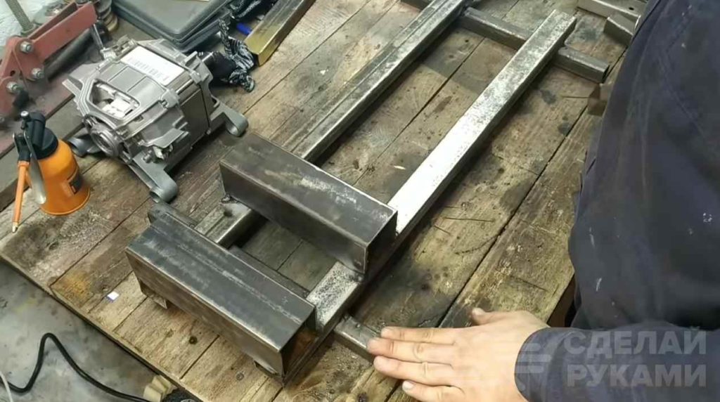 Из кусков листового металла и отрезков профильной трубы мастер делает две подвижные площадки, которые будут перемещаться по станине.