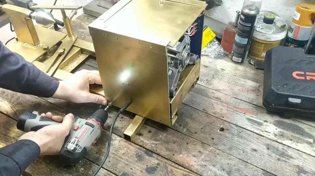 Из листового металла автор делает короб, внутри которого будут находиться двигатель и плата регулировки оборотов. На лицевую панель корпуса выводим кнопку включения и сам регулятор.