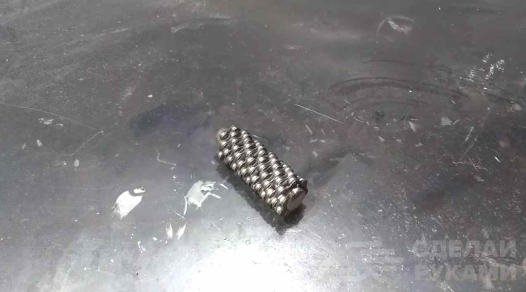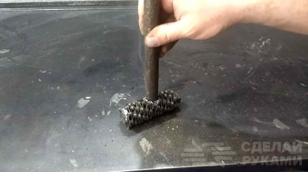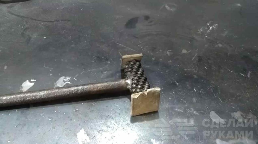 Первым делом отрезаем кусок круглой трубы подходящей длины. На него наматываем кусок велосипедной цепи и привариваем. Получилась головка молотка.