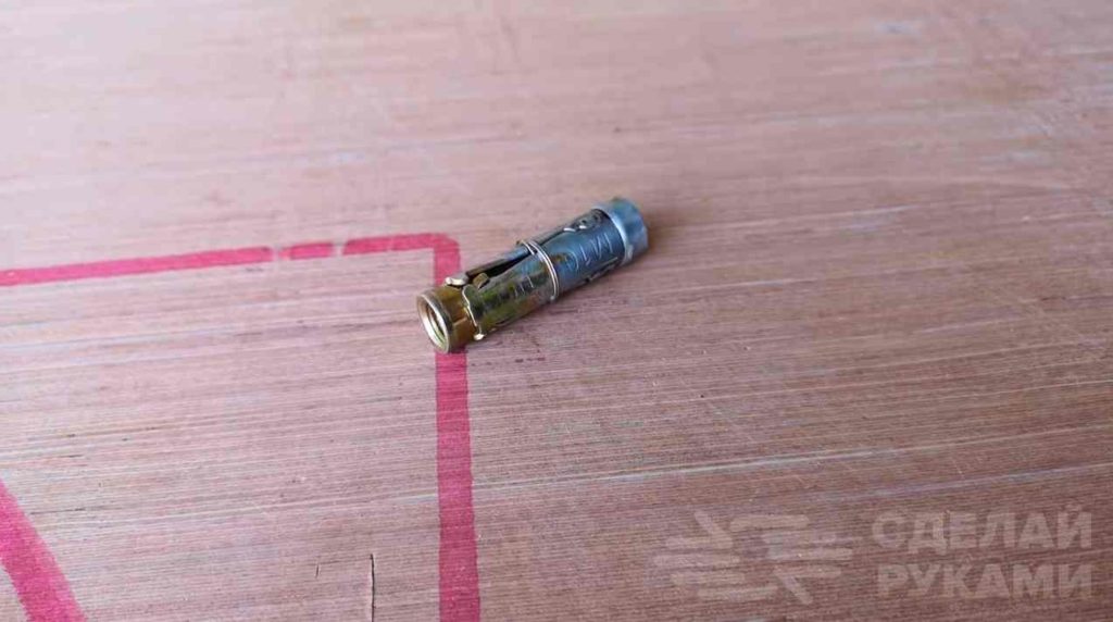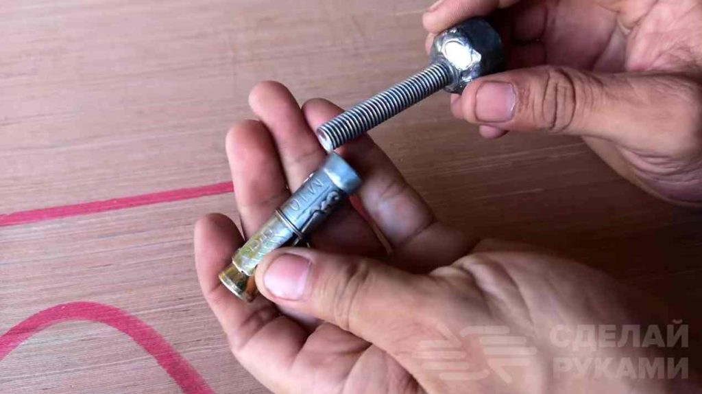 Помимо анкера, потребуется также большая шестигранная гайка и длинный стальной пруток с резьбой на конце. На этот пруток надевается ударная болванка с отверстием по центру.