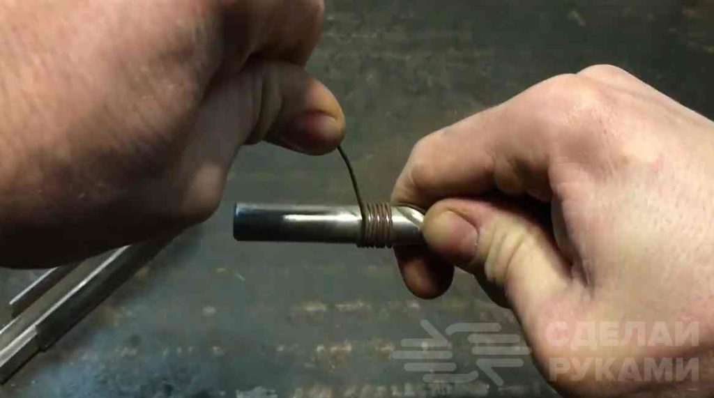 Далее в малый отрезок трубы вставляем металлическую трубку, равную диаметру шляпки шурупов. Растачиваем по внутреннему диаметру трубки завальцованые края при помощи надфиля.