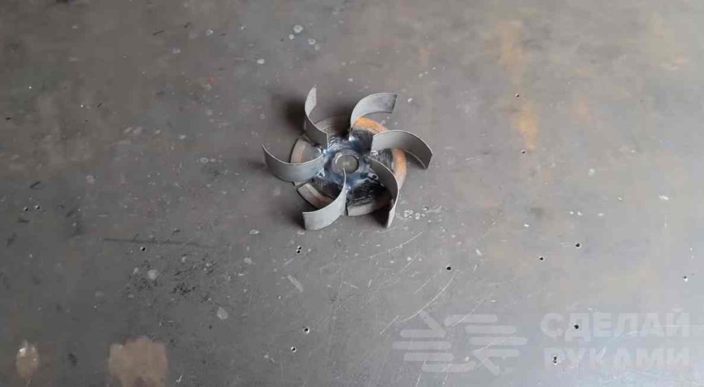 Первым делом автор отрезает от полосы металла небольшие кусочки, которые надо немного согнуть. Потом привариваем заготовки к старому диску для УШМ. В итоге у нас получилась крыльчатка для воздуходувки.