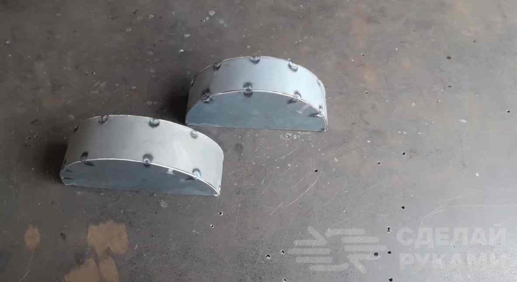 Далее из листа металла необходимо будет вырезать два круга. Разрезаем их пополам, затем свариваем два кожуха. Причем один из сваренных кожухов должен быть немного больше другого.