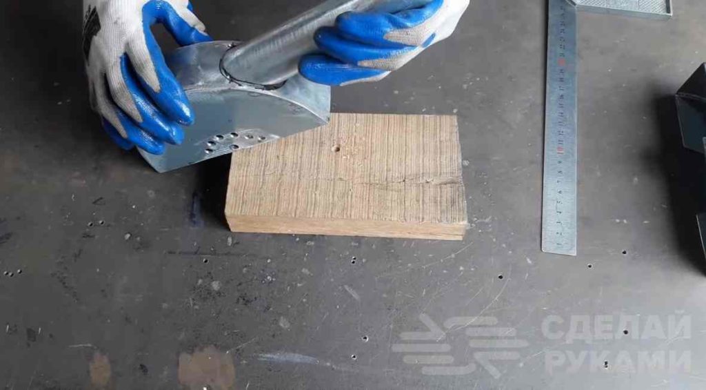 Ко второму кожуху автор приваривает кусок металлической пластины с отверстием («ушко»). Сварные швы зачищаем болгаркой.