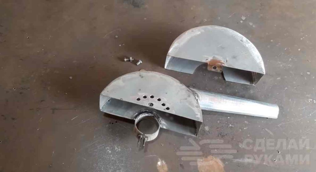 На следующем этапе мастер изготавливает самодельный хомут, и приваривает его к меньшему по размеру кожуху. Также к нему нужно будет приварить отрезок круглой трубки и просверлить воздухозаборные отверстия.