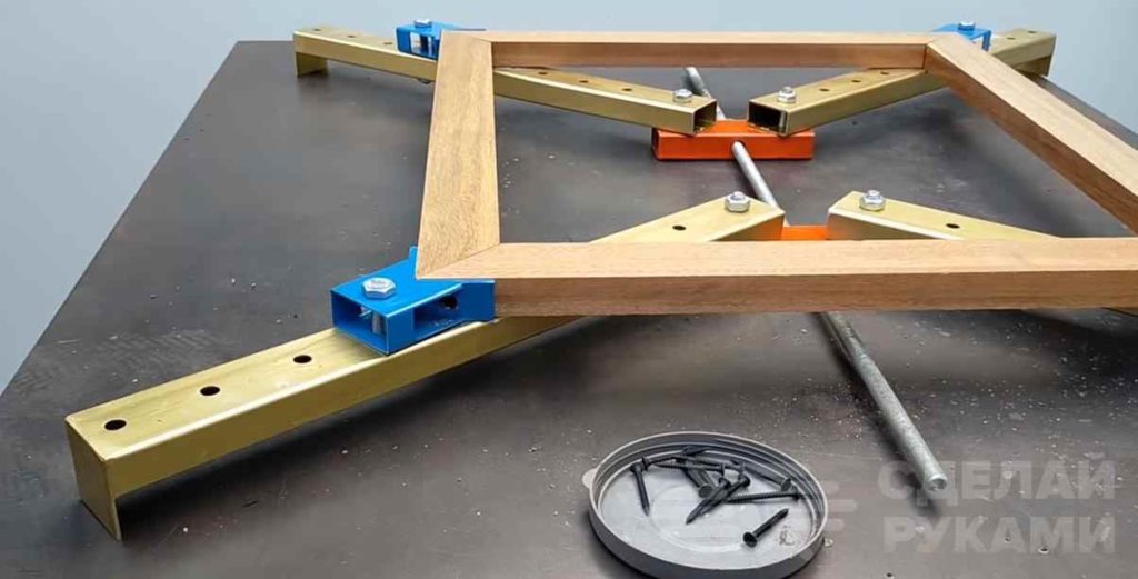 Используя эту струбцину, можно как сваривать рамки из металла (например, из круглой или профильной трубы), так и склеивать их из дерева — из брусков и досок.