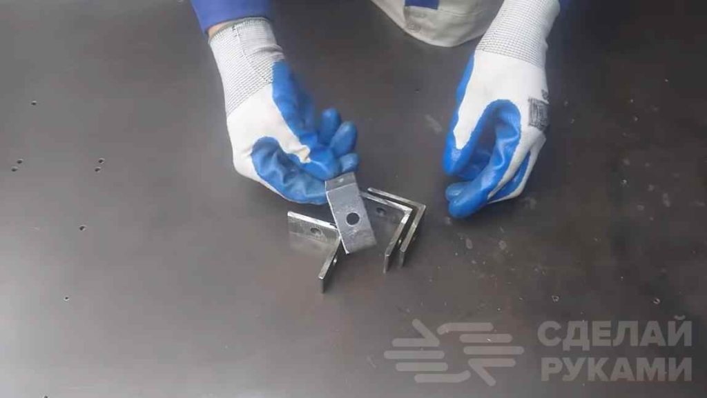 Первым делом от строительного уголка отрезаем четыре одинаковых куска, и сверлим в них отверстия. Напильником по металлу или с помощью УШМ убираем заусенцы.
