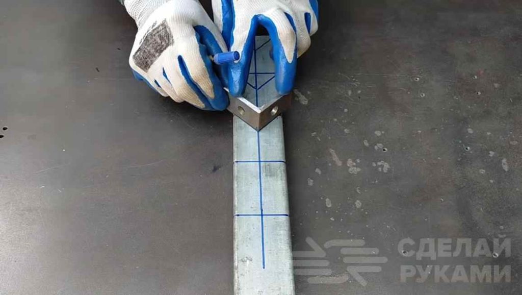 Далее отрезаем два куска профиля, делаем разметку и затем сверлим отверстия. В крайние отверстия вставляем куски шпильки, и обвариваем.