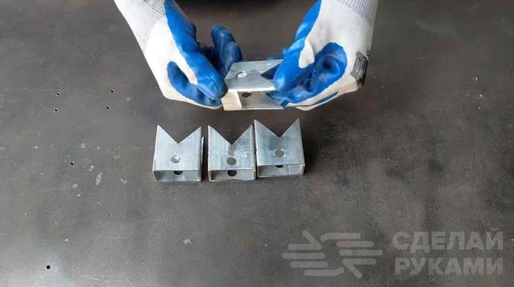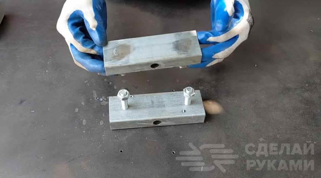 После этого делаем разметку на куске профильной трубы, и вырезаем из нее четыре прижимных губки. Сверлим в них отверстия.