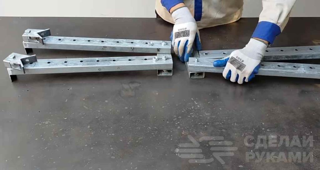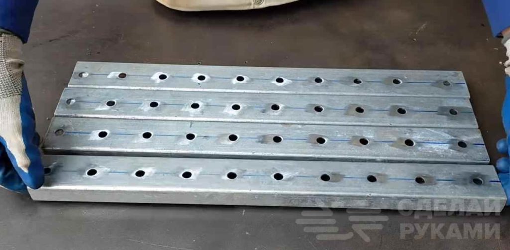 После этого отрезаем еще четыре заготовки из профильной трубы, и сверлим в них отверстия на одинаковом расстоянии друг от друга. К торцам привариваем пластины из металла.