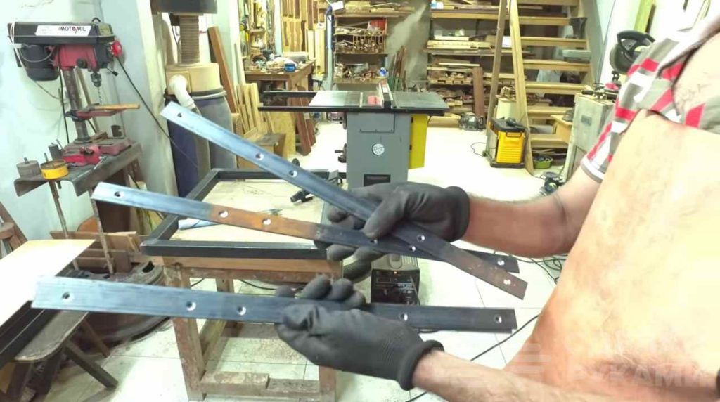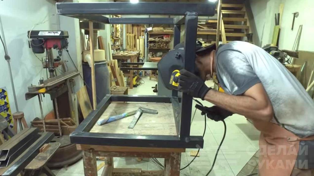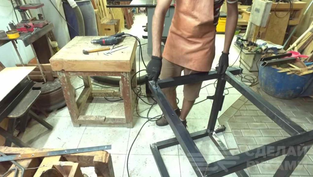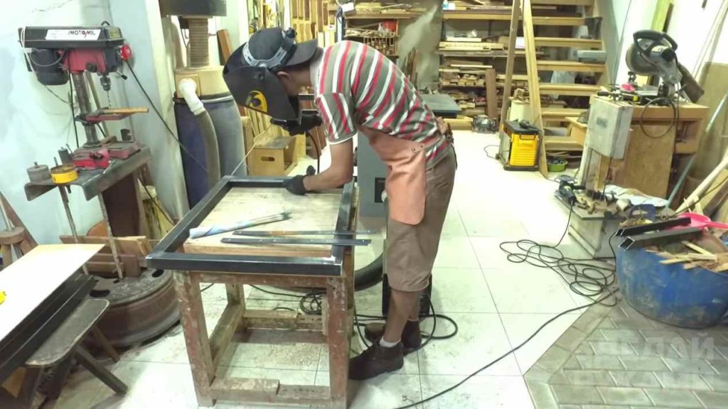 Далее свариваем каркас столешницы (тоже из профтрубы) и привариваем к нему металлические полосы с отверстиями — они нужны для крепления самой столешницы.