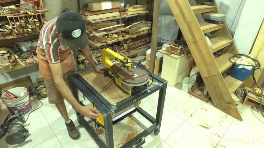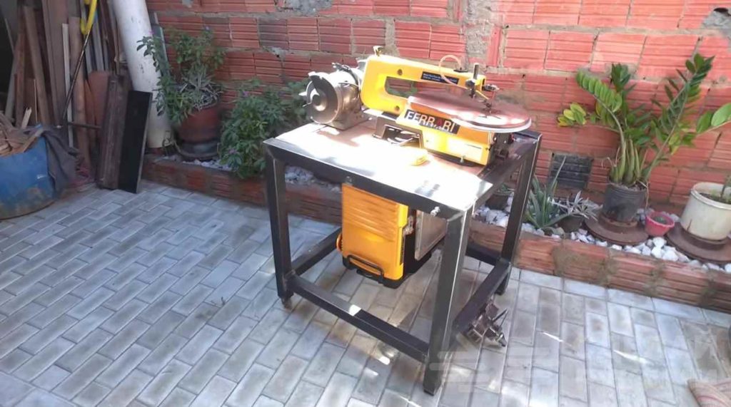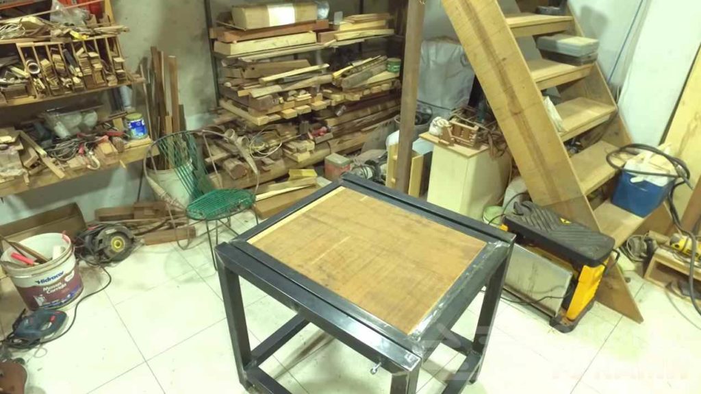 Благодаря тому, что столешница может поворачиваться на 360 градусов, к ней можно крепить разные станки как сверху, так и снизу. Каркас стола автор решил изготовить из профильной трубы, столешницу — из досок.