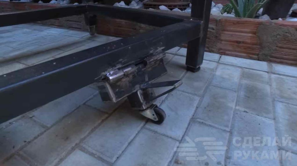 К двум ножкам стола автор приваривает колесики. Третье колесико поднимается и опускается при необходимости, и приваривается посередине нижней поперечины.